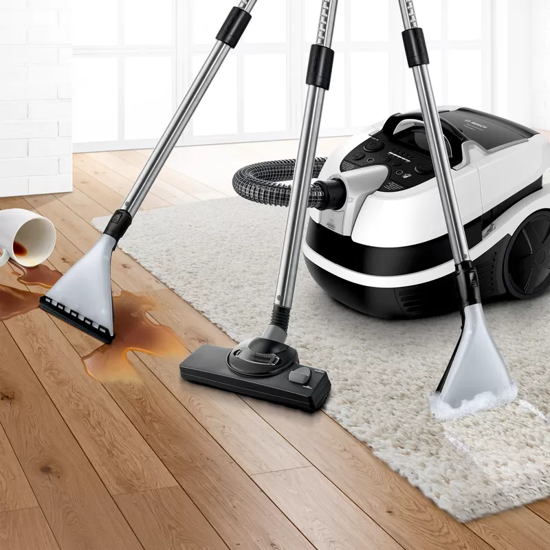 Primul aspirator wet&dry 3in1 de la Bosch cu motor de 2100W - spala covoarele, aspira lichide, curata toate tipurile de pardoseli. Cu accesorii ProPower pentru curatarea covoarelor.
