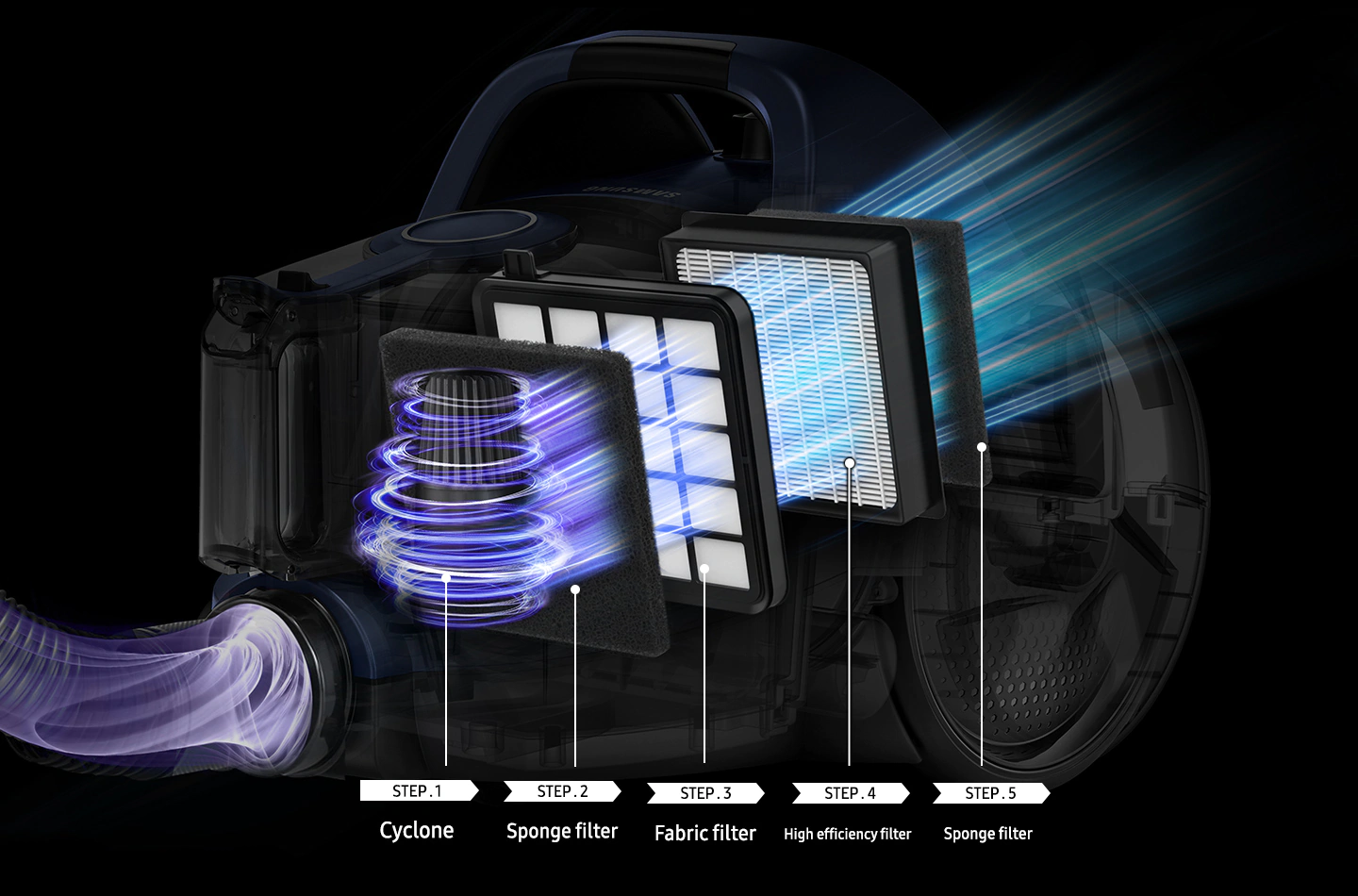 CycloneForce separa particulele mari de praf, filtrul burete si filtrul textil capteza praful de dimensiuni medii. Filtrul de inalta eficienta si filtrul burete capteaza praful fin.