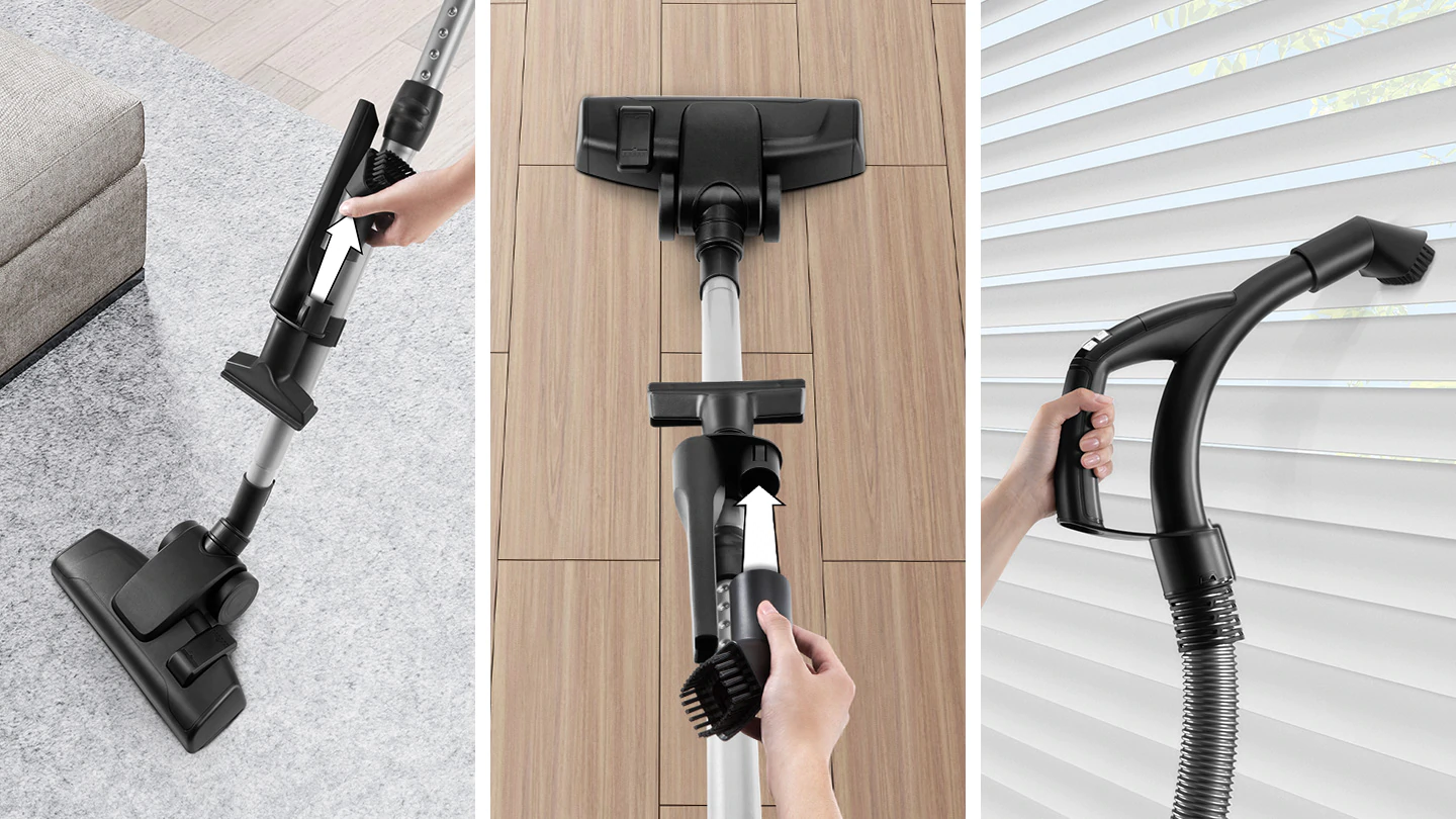 Accesoriile incluse sunt special concepute pentru spatii inguste, praf si tapiterie. Acestea pot fi schimbate cu usurinta si pastrate convenabil, intr-un suport atasat.