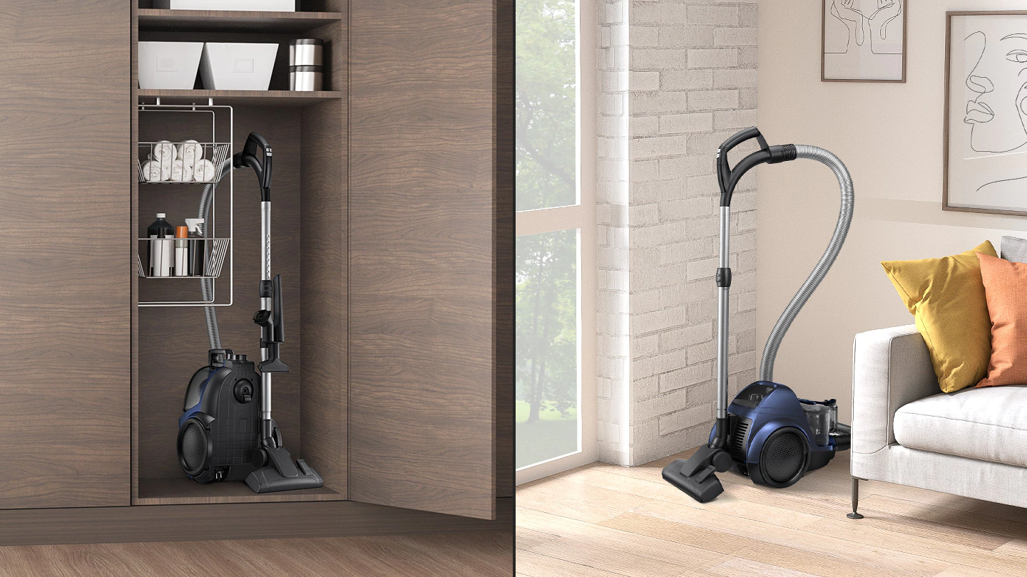Aspiratorul Samsung poate fi depozitat cu usurinta datorita sistemului de pozitionare bidirectionala. Nu trebuie sprijinit de perete, ocupand astfel mai putin spatiu pe podea. In plus, poate fi depozitat si in pozitie orizontala.