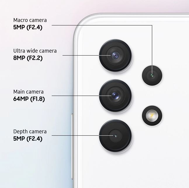 8 MP Ultrawide 5 MP Macro 5 MP Depth 64 MP Wide |