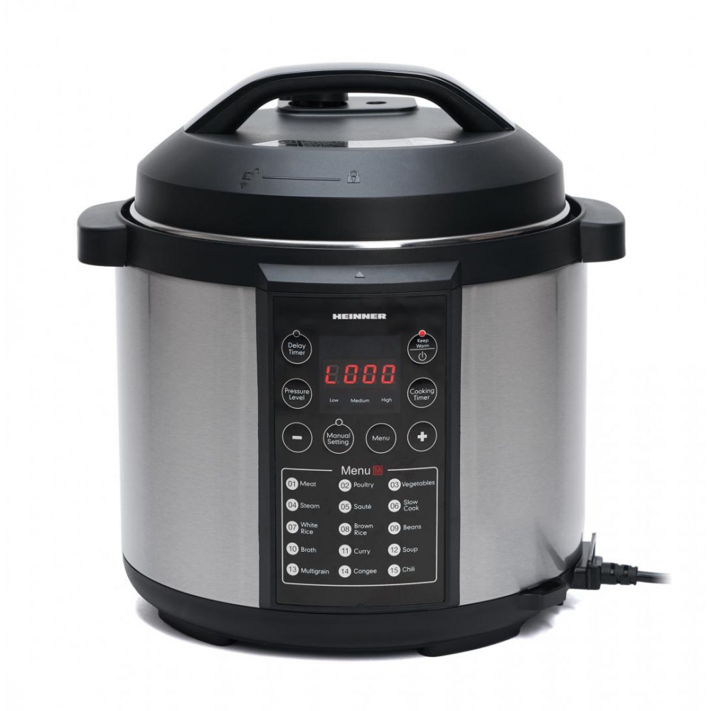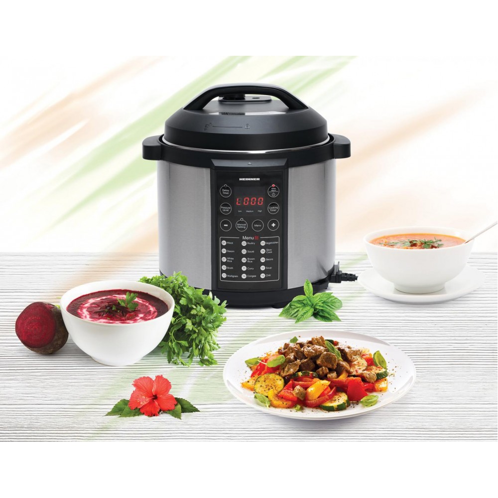 Multicooker cu gatire la presiune Heinner HPCK-6IX, capacitate maxima: 6L, las antiaderent detasabil, 15 programe presetate, timer - 24 ore, sistem de siguranta, display LED, buton pentru eliminarea presiunii, putere: 900W, inox.