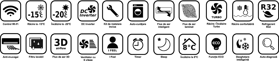 Pentru toate capacitățile, aparatele de aer condiționat includ kit de instalare, care conține 4m de țeavă, 4.3m de cablu, tub pentru drenajul condensului, bandă de matisat și protecție a traseului la trecerea prin perete.