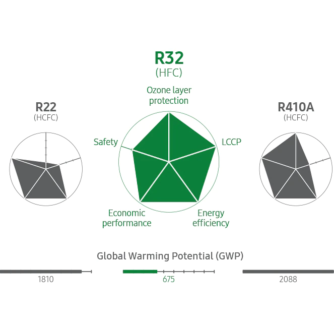 * Testat pe agentul frigorific R32 comparativ cu agentii frigorifici conventionali Samsung R410A si R22.