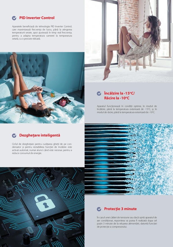 Dezghetare inteligenta: Dezghetarea unitatii exterioare nu se mai realizeaza la un anumit interval de timp, ci doar atunci cand este nevoie, prin aceasta oferind un confort sporit si o economie de energie.