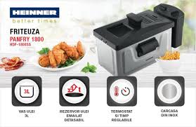Friteuza Heinner HDF-1800SS, putere: 1800W, capacitate ulei 3L, capacitate maxima pentru cartofi 500g, timer 30 min, termostat ajustabil, rezervor ulei emailat, datasabil, temperatura maxima 190˚C, carcasa din inox, indicator luminos
