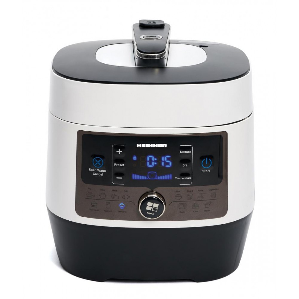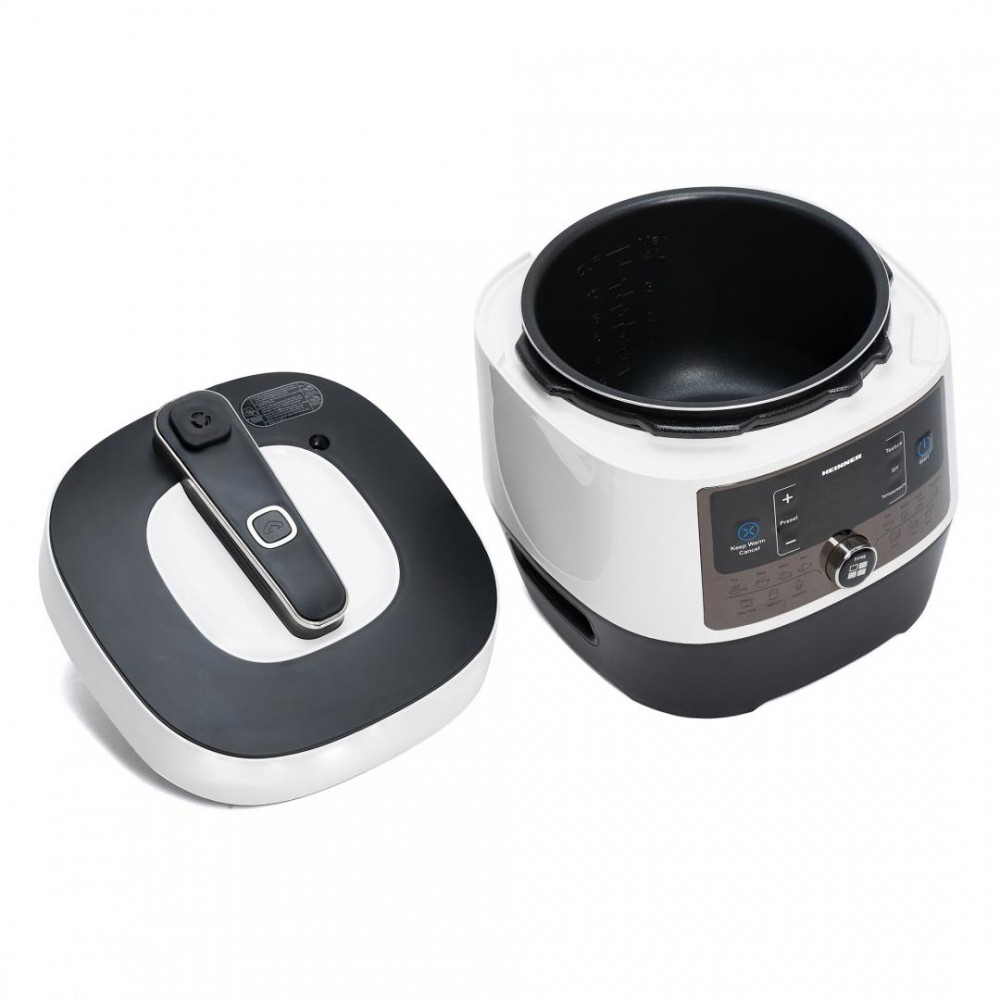 Multicooker cu gatire la presiune Heinner HPCK-6WH, capacitate maxima: 6L, vas antiaderent detasabil, 14 programe presetate, timer - max 24 ore, sistem de siguranta, display LED mare, buton pentru eliminarea presiunii, functie setare presiune, putere: 900W, alb.