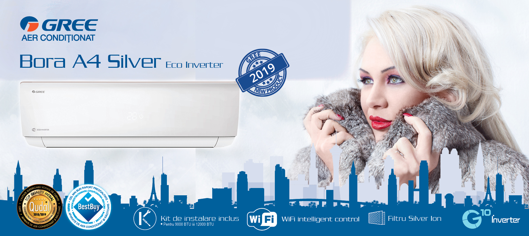 Bora Silver este noua serie de aparate de aer conditionat de la Gree, are un design nou pentru unitatea interioara. Usor de intretinut, filtru Silver Ion, functia I-Feel ( senzor de temperatuta in interiorul telecomenzii), functie de autocuratare, debit volumetric de aer in functie de nevoile utilizatorilor. Foloseste mai putina energie electrica pentru a functiona si va pastra temperatura camerei exact asa cum l-ati setat.