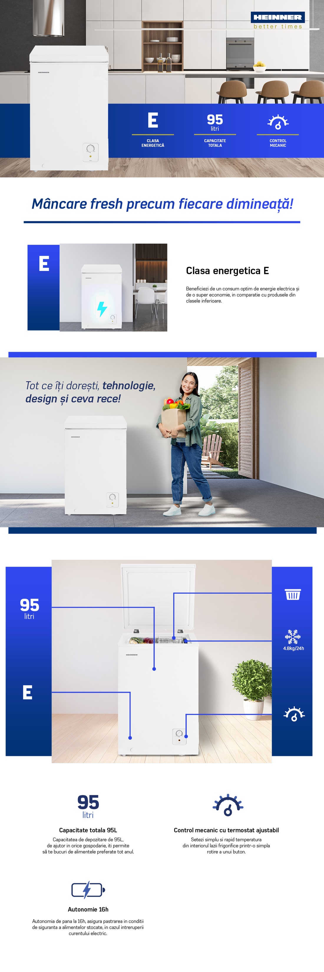 capacitate totala: 95L, clasa energetica: E, control mecanic cu termostat ajustabil, cos din sarma, maner integrat, decongelare manuala,