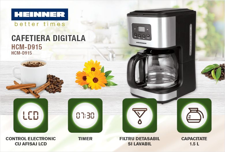 Cafetiera digitala Heinner HCM-D915, display LCD, putere: 900W, capacitate: 1.5L, timer programabil, afisare ceas, functie pastrare cald, functie anti-picurare, oprire automata dupa 2 ore, picioruse anti- alunecare, filtru lavabil detasabil, port filtru detasabil, culoare: negru cu decoratii din inox..