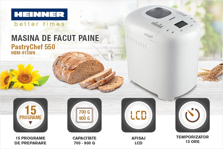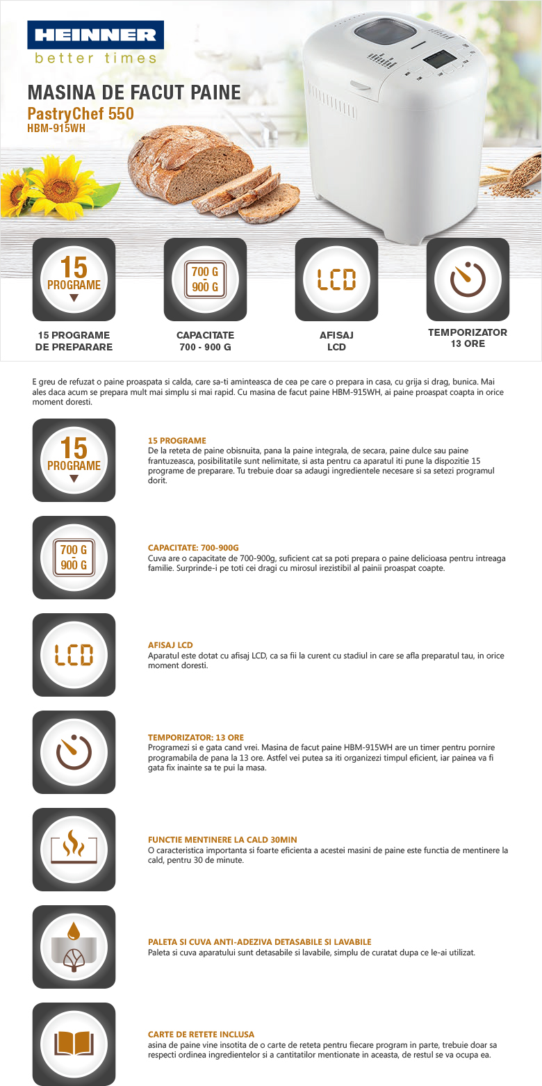 15 programe, capacitate 700-900g, display LCD, 3 setari de rumenire:deschis, mediu, inchis, timer 13 ore, functie mentinere la cald 30 min,cuva