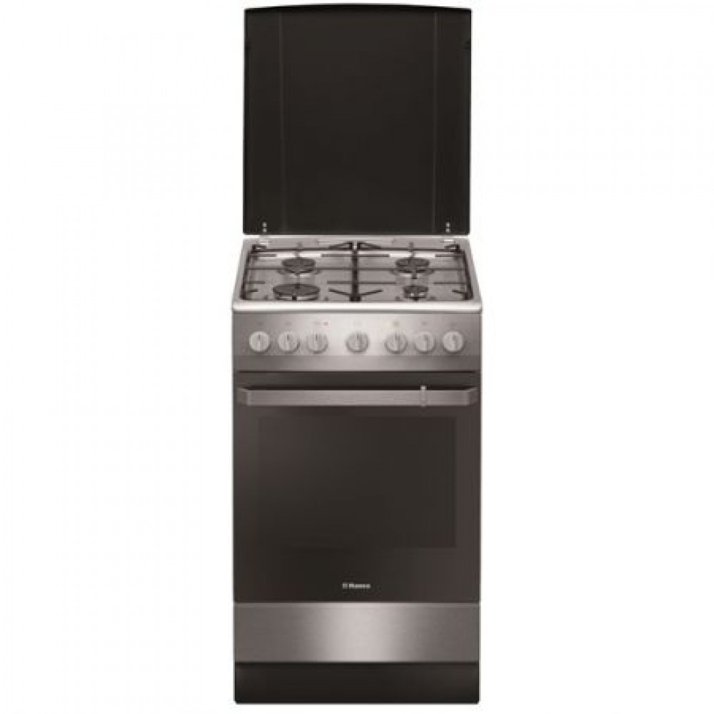 Aragaz Hansa FCCW580009, 4 arzatoare ceramice, cuptor electric clasa energie A, putere totala 8.7kW, capacitate 65l, iluminare cuptor, 8 functii, curatare pyrolitica, interior negru, convectie aer fierbinte, ventilator, incalzire superioara, tava, gratar cuptor, sertar, dimensiuni 85 x 60 x 60, culoare inox