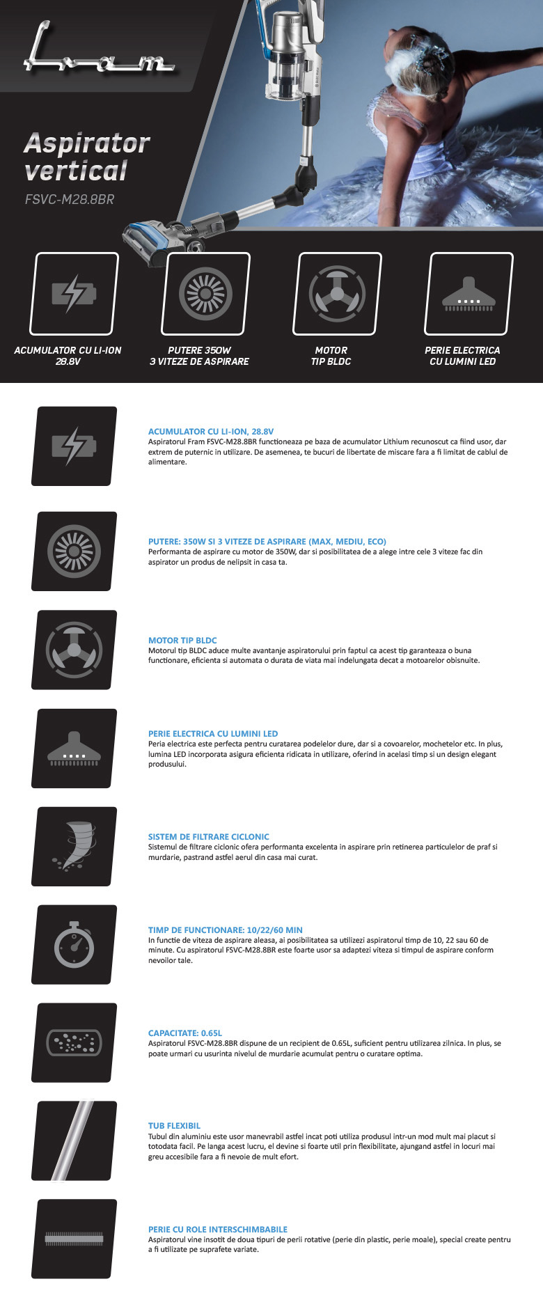 Aspirator vertical, putere: 420W, sistem de filtrare ciclonic, motor de curent continuu fara perii, acumulator cu Li-Ion, 29.6V, filtru HEPA, perie