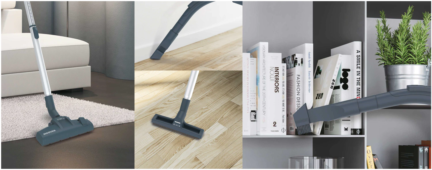 Aspiratorul vine echipat cu duza pentru covor si podea, duza pentru colturi greu accesibile si peria de praf.
