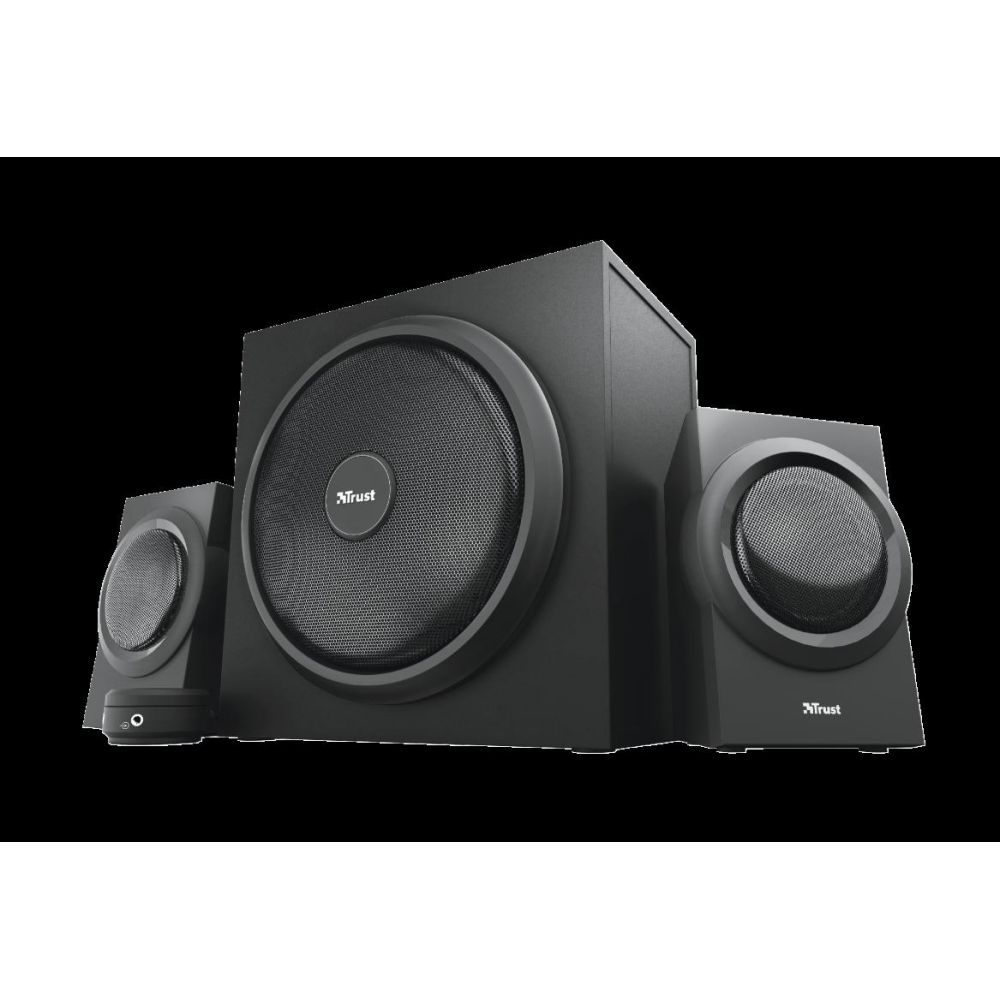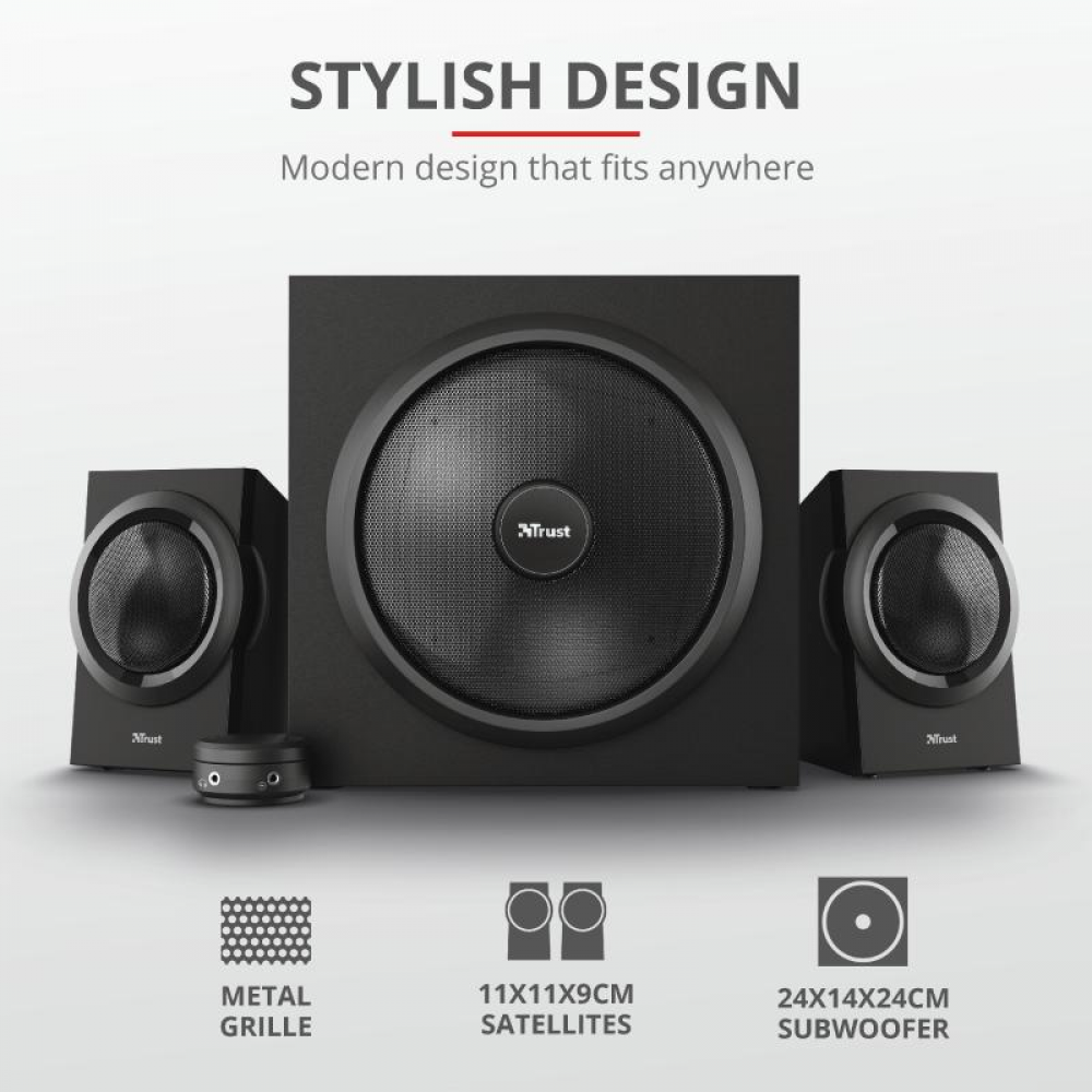 Sistem audio Trust Yuri 2.1 Speaker Set Specifications General Height of main product (in mm) 240 mm Width of main product (in mm) 180 mm Depth of main product (in mm) 240 mm Total weight 3720 g Weight of main unit 2220 g Connectivity Connection type wired Cable length power cable 150 cm Cable length audio cable 150 cm Cable length satellite cable 140 cm Bluetooth no Cable length subwoofer to remote cable 180 cm Cables included power cable,3.5mm audio cable Audio Driver units 3 Speaker impedance 4 Ohm Audio input 3.5 mm Input impedance 680 Ohm Audio output None Headphone connection yes Microphone built-in yes Microphone connection no Power output (peak) 120 W Power output (RMS) 60 W Power output - subwoofer (RMS) 30 W Power output - satellite (RMS) 15 W Frequency response 20 Hz - 20000 Hz Features NFC no Hands-free phone calls no Tripod mount no Accessories 3.5mm audio cable Power saving yes Lighting Lights no Protection Waterproof no Power Power cable detachable yes Input Power source wall socket Compatibility Compatible Consoles no Compatible Device Types pc, smartphone, laptop, tablet Control Controls volume Remote control wired Satellites Satellite Height (mm) 154 mm Satellite Width (mm) 115 mm Satellite Depth (mm) 75 mm Satellite Weight (gr) 350 gr Subwoofer Subwoofer Height (mm) 240 mm Subwoofer Width (mm) 180 mm Subwoofer Depth (mm) 180 mm Subwoofer Weight (gr) 2222 gr.