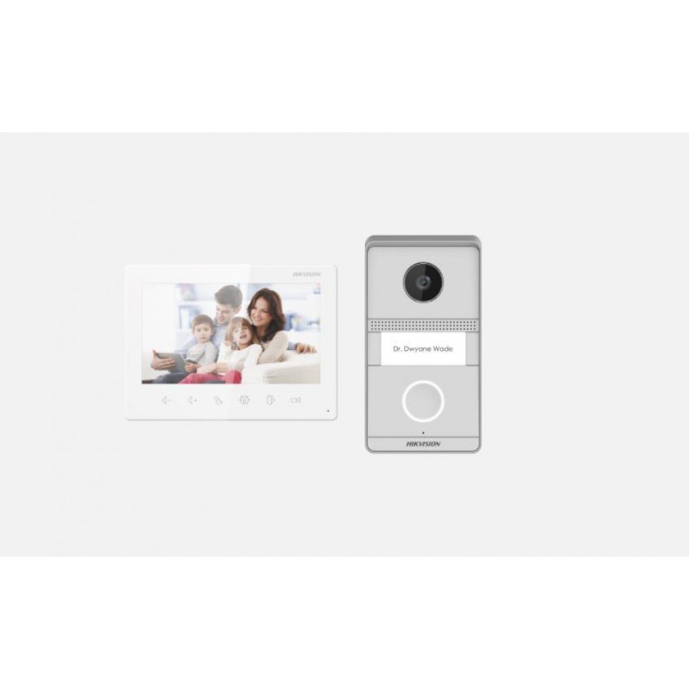 Kit videointerfon analog Hikvision DS-KIS101-P/Surface, conectare usoara pe 2 fire, plug & play. Kitul este format din: post exterior -1 buc ( 1 buton de apelare, camera color 2MP HD, rezolutie: 1024x600, audio: microfon si difuzor incorporat, IP65, IK7,iesire de releu x 2, montaj aplicat), post interior -1buc ( 7-inch color TFT, 6 butoane, rezolutie: 1024 × 600, volum ajustabil, dimensiuni: 187 mm × 137 mm × 25.4 mm), sursa de alimentare x 1buc, carcasa protectie ploaie x 1buc.