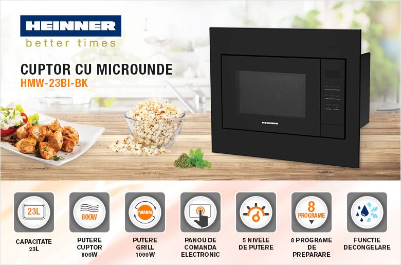 HMW-23BI-BKCuptor cu microunde incorporabil Heinner HMW-23BI-BK, 23 l, 800 W, Digital, Timer, Grill, Sticla neagra