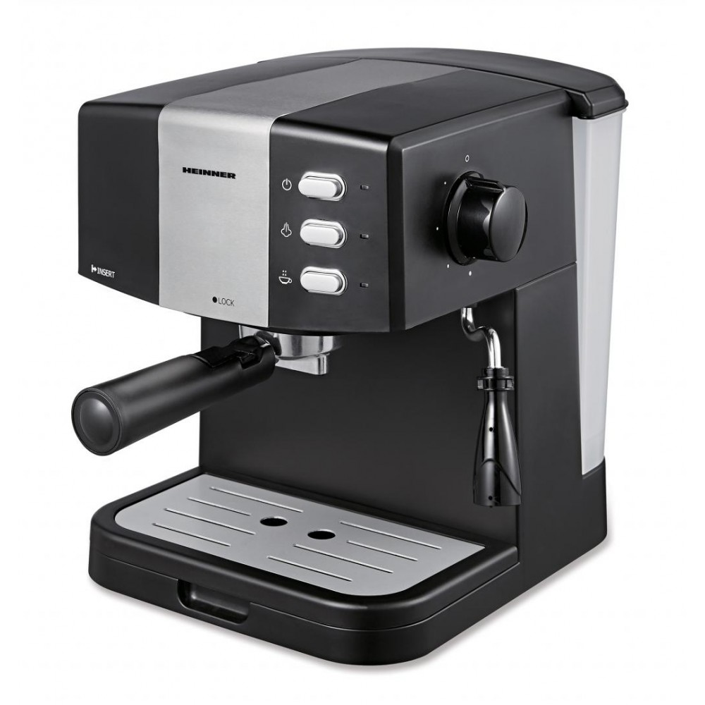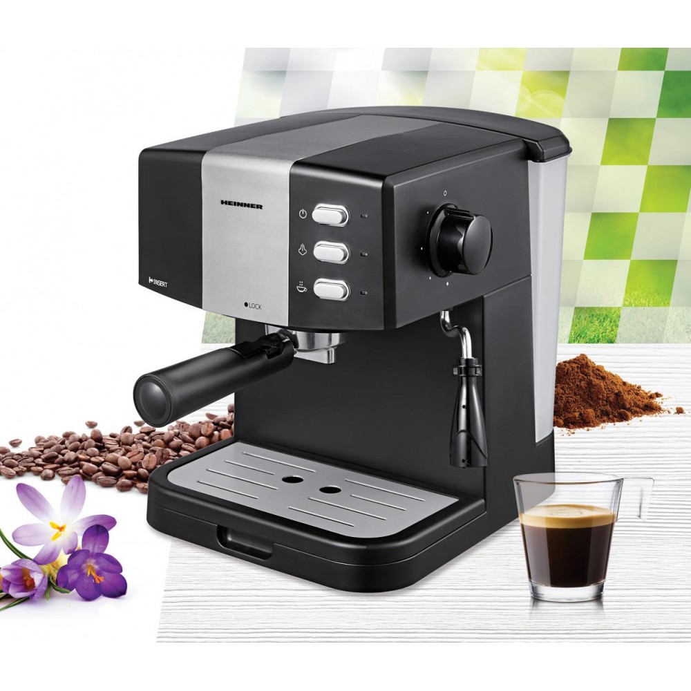 Espresor Heinner HEM-850BKSL, pompa presiune 15 bar, filtrul dublu din inox, preparare espresso si spuma de lapte, capacitate rezervor detasabil 1.5L, tavita scurgere detasabila, protectie supraincalzire, valva de siguranta presiune, putere 850W, negru.