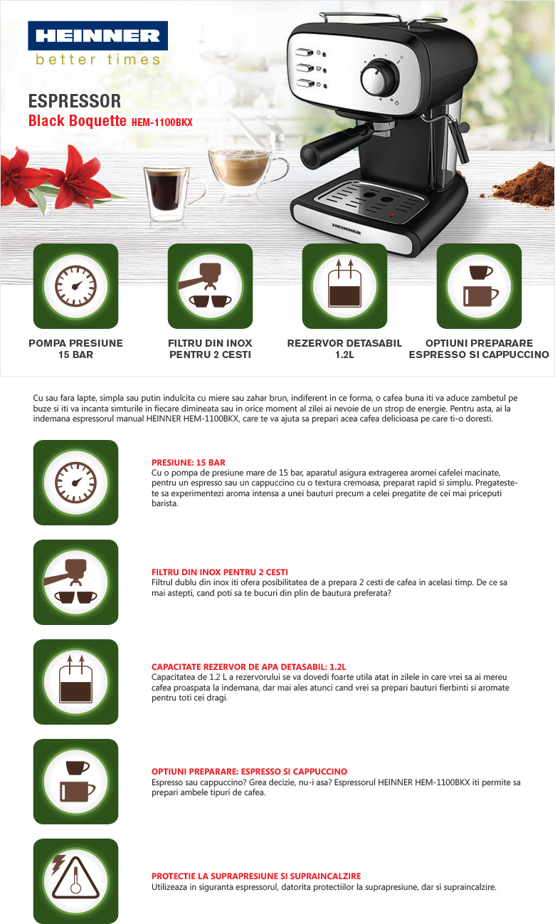 Presiune: 15 bar, rezervor detașabil 1.2L, boiler din aluminiu turnat, filtru din inox pentru 2 cești, presiune mare la spumare, protecție la supraîncălzire, protecție la suprapresiune, putere: 850W, ornamente din inox.