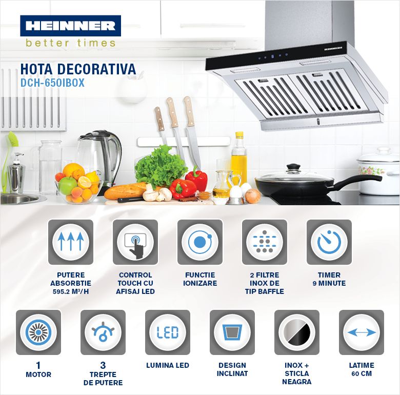 DCH-650IBOXHota incorporabila decorativa Heinner DCH-650IBOX, Putere absorbtie 595.2 m3/h, 1 motor, 60 cm, Control touch, Functie ionizare, Recipient colectare grasime, 2 filtre metalice, Inox + sticla neagra