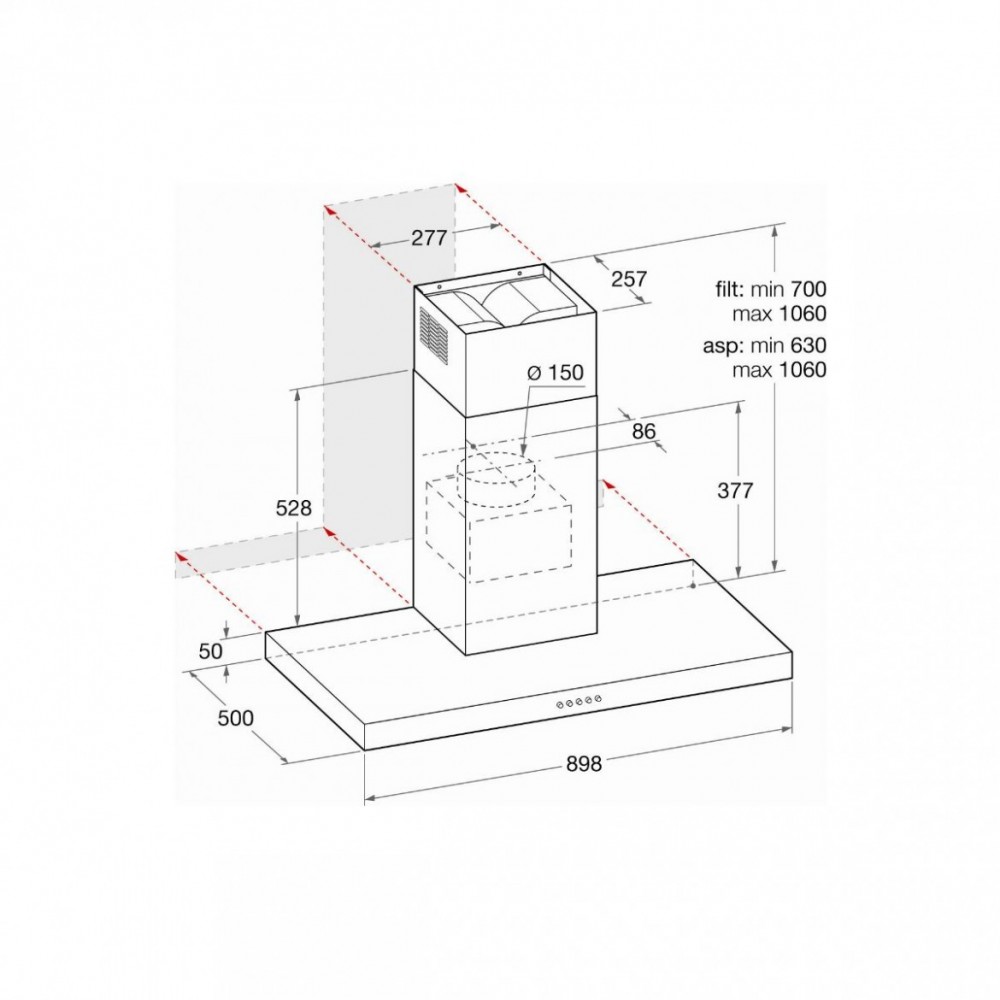 Hota decorativa, versiune filtranta, 1 motor - debit de aspirare min. 251 m3/h, max. 343 m3/h (cu funcţia booster 688 m3/h), Nivel de zgomot min. 52, max. 61 dB(A) (cu funcţia booster 74 dB(A)), 3 viteze, comenzi butoane soft.