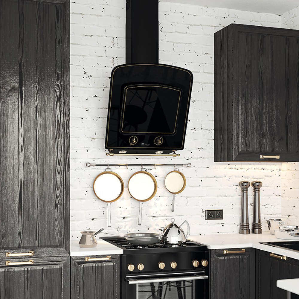 Hota Tornado Retro 1000 în stilul Provincie. Sticla termorezistenta cu un desen în stil retro, grinzile și butoanele de schimbare a vitezelor sunt realizate din metal vopsit în bronz, auriu sau nunță de cupru. Culoarea necesară a mânerelor și a grindei transversale poate fi comandată separat. În afara frumuseței necondiționate și aspectului foarte atractiv, hota este echipată cu un motor foarte puternic, silențios, economic, cu trei viteze de rotație și cu o turbina cu capacitatea de 1000 m3 / h, precum și cu lămpi foarte luinoase și economice LED. Are clasa B de eficiență energetică. Hota este echipată cu un filtru din aluminiu cu cinci straturi anti-grăsime, opțional poate fi echipată cu două filtre de carbon FW E15100 pentru recircularea aerului. Hota este potrivită pentru încăperi mai mari de 20 m2 cu diametru la țeavă de 150 mm.