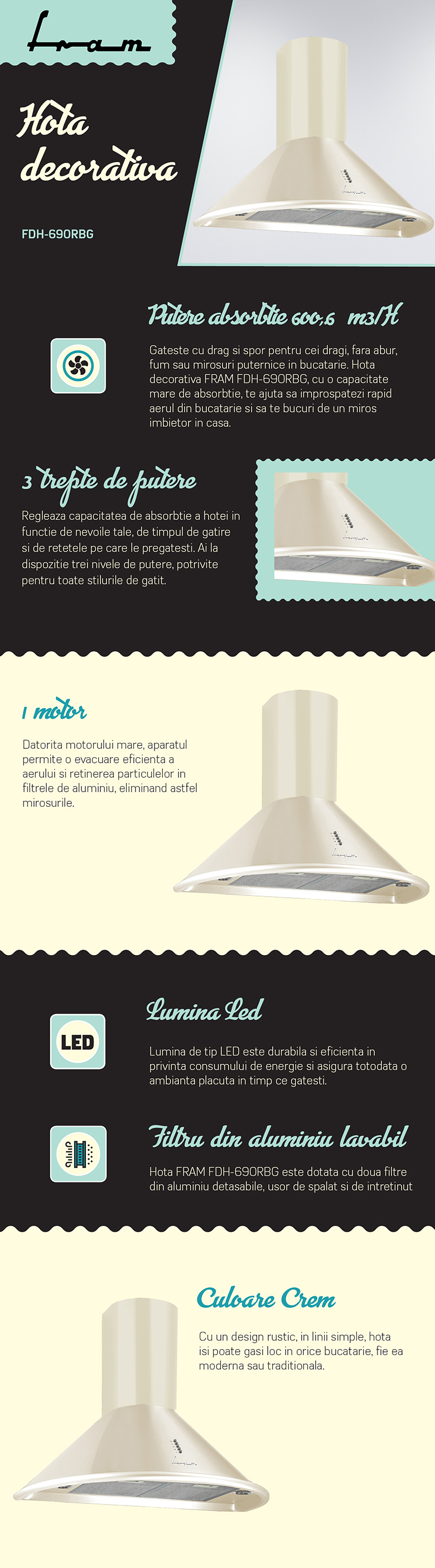 HOTA DECORATIVA FRAM FDH-690RBG , PUTERE DE ABSORTIE 600.6 M3/H, 1 MOTOR X 190W, LUMINA LED 2X2W, 3 TREPTE DE PUTERE, 90x54.5x(71-109) cm, CLASA ENERGETICA B, 90 CM, DESIGN RUSTIC, BEIGE