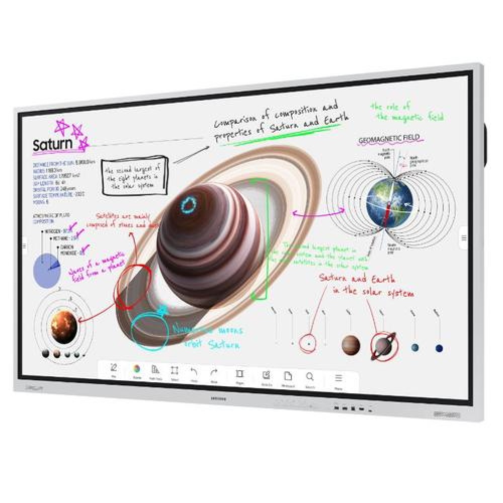Display interactiv (tabla interactiva) Samsung Flip Pro WM75B, 75" (191cm), UHD, operare 16/7, luminozitate 350nit (without glass), backlight New Edge 60Hz, timp raspuns 6ms, contrast 4500:1, haze 8%~12%, Tizen 6.5, Flip App, CPU A72*4, RAM 2GB, stocare 32GB, Front Connectivity, Document viewer, Smartview+, Video player, Web browser, Samsung workspace (RDP/VNC, Office365, VMWare), Edu tool, Google Classroom, WebRTC; Conectivitate: WiFi, BT(keyboard/mouse, speaker), 1xDP, 2xHDMI (1 spate 1 fata), 4xUSB(USB-C fata, 2 pt SoC fata/spate, 1 3.0 fata), Interfata OPS, 1xLAN, 1xRS232C, 1xIR, Audio Out Stereo Mini Jack, Touch Input, 2xTouch Out, RS232C, RJ45(for MDC); Sticla protectie anti-glare securizata 3.2T cu pelicula hidrofoba, antimicrobiala si shatter-proof, Landscape only, No Pivot, boxe 4x10W, culoare alb, dimensiuni 1724x1026.3x89mm, VESA 400x400, greutate 59.3kg, consum max 460W, garantie 3 ani; Necesita suport de perete sau stand mobil