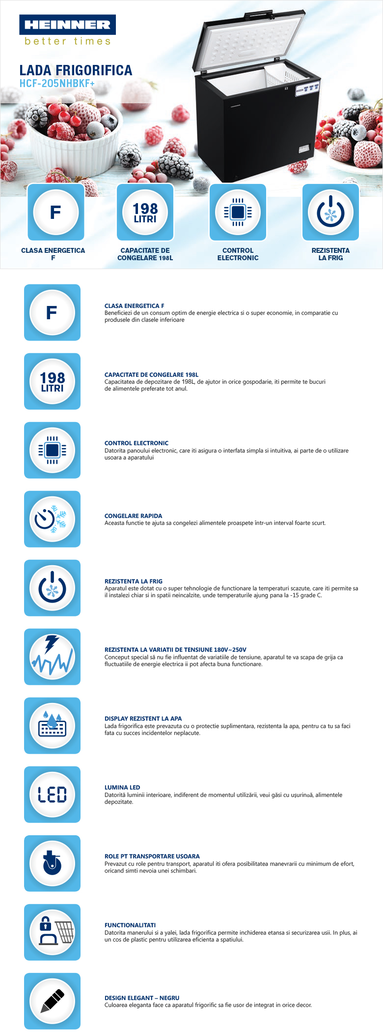 Termostat reglabil Congelare rapida Role Rezistenta la frig Display rezistent la apa Lumina LED Inchidere etansa si securizare usa |