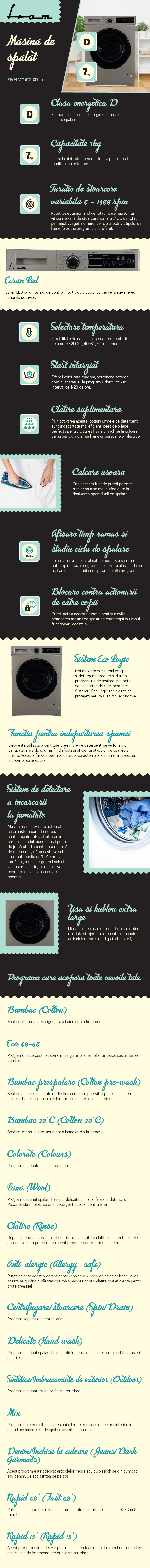 Clatire suplimentara Functie anti-sifonare Functie start intarziat (1-23h) Incarcare la jumatate Selector viteza centrifugare Selector temperatura de spalare Afisare timp ramas si stadiu ciclu de spalare Functia pentru indepartarea spumei |