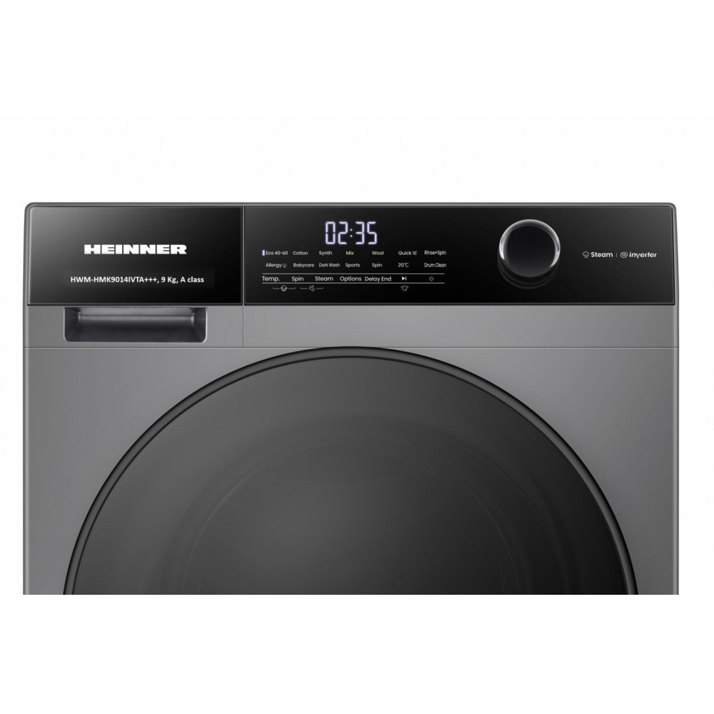 MASINA DE SPALAT RUFE HEINNER HWM-HMK9014IVTA+++, CAPACITATE 9KG, VITEZA DE CENTRIFUGARE 1400RPM, CLASA ENERGETICA A, MOTOR INVERTER, 15 PROGRAME, CONTROL TOUCH, DISPLAY DIGITAL, PROGRAM RAPID 15 MIN, PROGRAM ALLERGY STEAM, PROGRAM BABY STEAM CARE, FUNCTIE INTARZIERE FINALIZARE, CLATIRE SUPLIMENTARA, PRESPALARE, FUNCTIE ADAUGARE RUFE, CANTARIRE AUTOMATA, MEMORARE PROGRAM PREFERAT, SELECTOR TEMPERATURA, SELECTOR VITEZA DE CENTRIFUGARE, BLOCARE ACCES COPII, DIMENSIUNI ( LXAXI): 59.5X61X84.5 CM, CULOARE: GRI TITANIUM