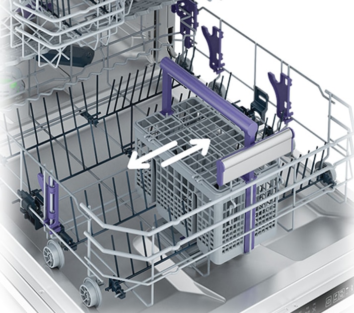 Flexibilitatea imbunatatita a masinii de spalat vase permite incarcarea rapida a cosului pentru tacamuri si mutarea acestuia pe lateral. Spatiul este folosit la capacitate maxima.