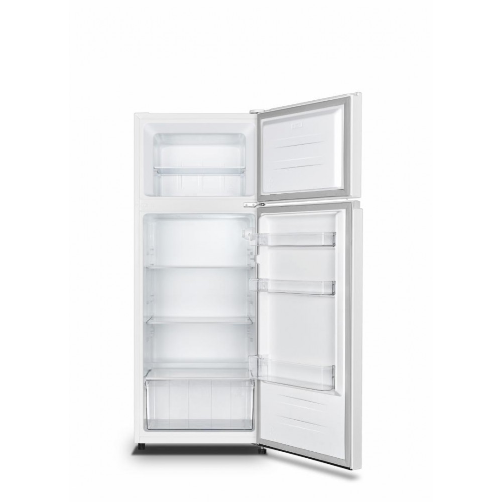 clasa energetica: E, capacitate totala: 206L, capacitate frigider: 165L, capacitate congelator: 41L, control mecanic cu termostat reglabil, lumina LED, 3 rafturi din sticla, compartiment pentru fructe si legume, usi reversibile, suport oua, tavita cuburi de gheata, capacitate congelare: 2kg/24h, dimensiuni (WxDxH): 55 x 54.2 × 143.4 cm, culoare: Alb