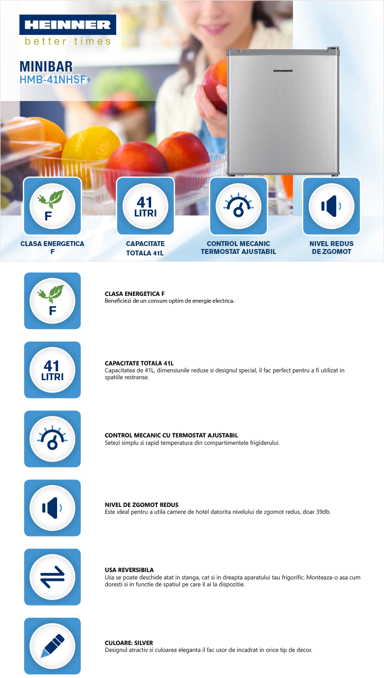 Clasa energetica: F, Capacitate totala: 41L, Control mecanic cu termostat ajustabil, 1 raft sarma, Usa reversibila, Dimensiuni (WxDxH): 44 x 47 x 51 cm, Culoare: Argintiu