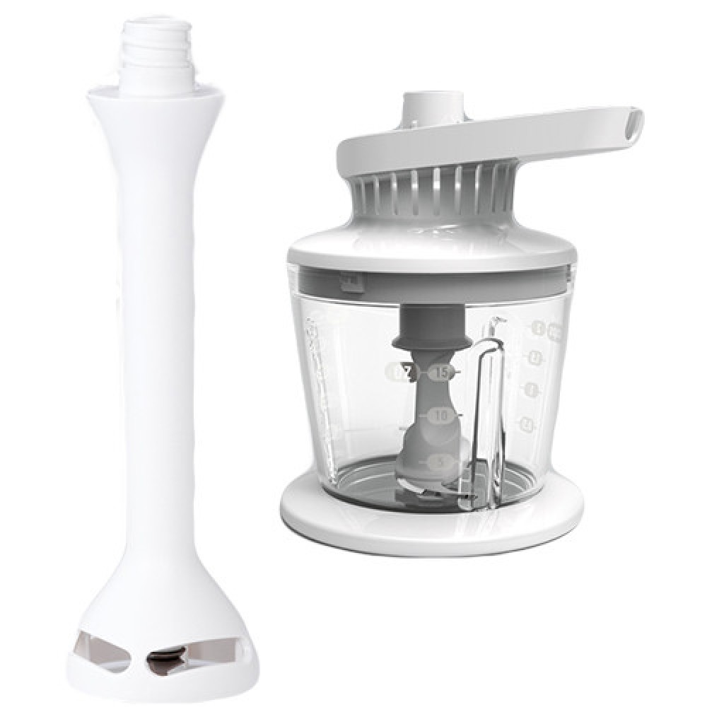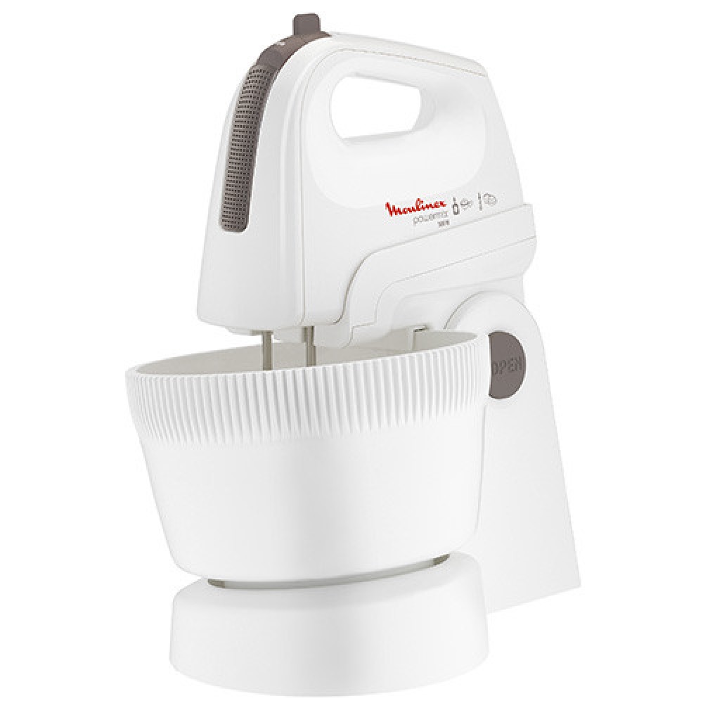 Mixer de mana cu bol rotativ Moulinex, 500 W, 3.3 l, 5 viteze, functie turbo, mini-tocator, accesorii: teluri metalice, carlige pentru aluat, bol rotativ 3.3 l, picior pasator, mini-tocator 500 ml, functie framantare, ax detasabil, culoare: alb.