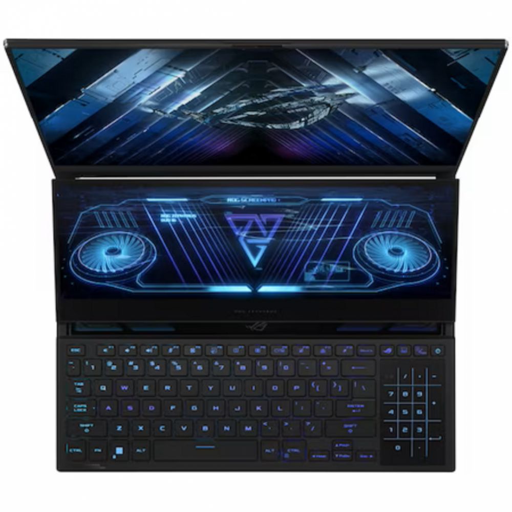 Laptop Gaming ASUS ROG Zephyrus Duo 16, GX650PZ-NM041W, R9-7945HX, 16-inch, QHD+ 16:10 (2560 x 1600, WQXGA), 240Hz, (RTX 4080), AMD Radeon Navi2 Graphics, 16GB DDR5-4800 SO-DIMM *2, 1TB PCIe 4.0 Performance , Optimus, Mini LED, 1200, anti-glare display, FreeSync Premium Pro, ROG Nebula HDR Display, 2x SO-DIMM slots, Support dual channel memory, 1. 2xPCIe*4, 2x DDR5 SO-DIMM slots, 2x PCIe, Wi-Fi 6E(802.11ax) (Triple band) 2*2 + Bluetooth 5.2, 1x 2.5G LAN port, 1x RJ45 LAN port, 1x Type C USB 4 support DisplayPort / G-SYNC, 1x USB 3.2 Gen 2 Type-C support DisplayPort / power delivery / G-SYNC, 2x USB 3.2 Gen 2 Type-A, 1 x card reader (microSD) (UHS-II 312MB/s), 1x HDMI 2.1, 1 x.3.5mm Combo Audio Jack, FHD 1080P@30FPS, Built-in 3-microphone array, Backlit Chiclet Keyboard Per-Key RGB, ScreenPad Plus (14 3840 x 1100(4K) IPS-level Panel Support Stylus), 6-speaker system with Smart Amplifier Technology, AI noise-canceling technology, Dolby Atmos, Hi-Res certification, Smart Amp Technology, Support Microsoft Cortana near field/Far field, Weight: 2.55 Kg, Dimension: 35.5 x 26.6 x 2.05 ~ 2.97 cm, Black, BIOS Administrator Password and User Password Protection, Trusted Platform Module, Windows 11 Home