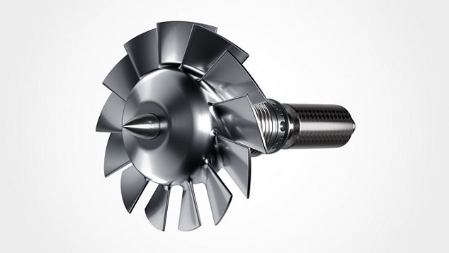 Rotorul său cu 13 paleți se rotește până la 110.000 rpm, generând o presiune de 3.2 kPa - suficient pentru a crea efectul Coanda.