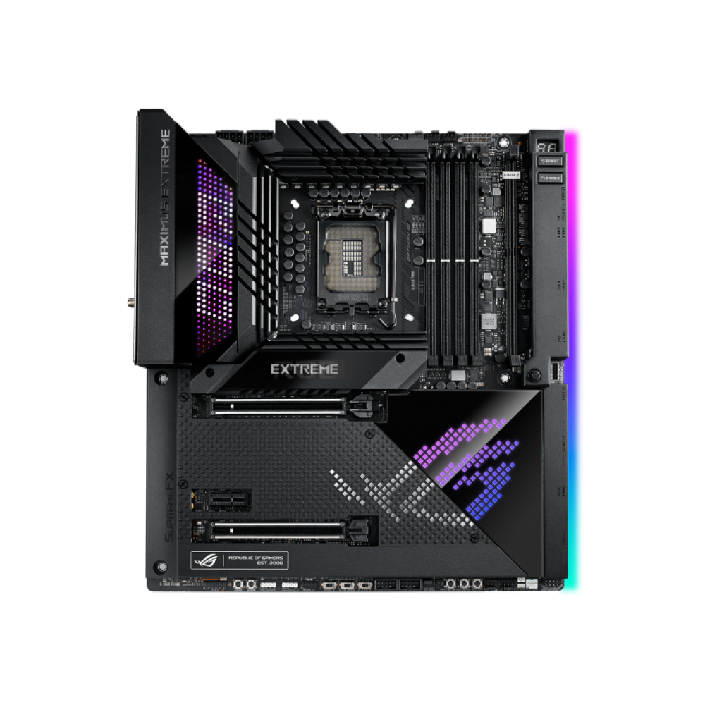 Placa de baza Asus ROG MAXIMUS Z690 EXTREME LGA 1700 ROG MAXIMUS Z690 EXTREME Intel® Z690 EATX motherboard with 24+1 power stages, DDR5 with OptiMem III, Five M.2, USB 3.2 Gen 2x2 front-panel connector with Quick Charge 4 + Support, Dual Thunderbolt™ 4, PCIe® 5.0, Onboard Wi-Fi 6E and Aura Sync RGB lighting Socket LGA1700 for 12th Gen Intel® Core™, Pentium® Gold and Celeron® Processors Intelligent Control: ASUS-exclusive tools including AI Overclocking, AI Cooling, AI Networking and Two-Way AI Noise-Cancelation for easy configuration Robust Power Solution: 24+1 teamed power stages rated for 105 A, ProCool II power connectors, MicroFine alloy chokes and premium metallic capacitors Optimized Thermal Design: Cold forged heatsink, enlarged VRM heatsinks plus integrated aluminum I/O cover, high-conductivity thermal pad, penta M.2 heatsinks and dual with embedded backplates and ROG Water-Cooling Zone High Performance Networking: Onboard Wi-Fi 6E, Marvell® AQtion 10Gb, Intel® 2.5Gb Ethernet, and ASUS LANGuard Fastest Gaming Connectivity: PCIe® 5.0, Gen 5 M.2 slots, USB 3.2 Gen 2x2 front-panel connector with Thunderbolt™ 4 support, rear triple USB Type- C® ports Industry Leading Immersive Audio: ROG SupremeFX ALC4082 codec with ESS® ES9018Q2C DAC for high-fidelity audio Unmatched Personalization: AniMe Matrix™ LED display, 2" LiveDash OLED, ASUS-exclusive Aura Sync RGB lighting, including one RGB header and three addressable Gen 2 RGB headers DIY Friendly Design: Pre-mounted I/O shield, PCIe slot Q-release, V- Latch switch, BIOS FlashBack™, Q-Code, FlexKey, Q-Connector, M.2 Q- Latch, SafeSlot, ROG Glavis and ROG graphics card holder Renowned Software: Bundled 1-year AIDA64 Extreme subscription and intuitive UEFI BIOS dashboard with integrated MemTest86