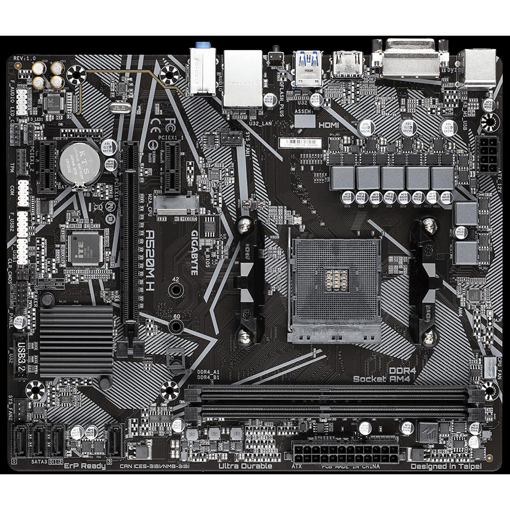 Placa de baza Gigabyte A520M H AM4 CPU AMD Socket AM4, support for: 3rd Generation AMD Ryzen™ processors/ 3rd Generation AMD Ryzen™ with Radeon™ Graphics processors (Please refer "CPU Support List" for more information.) Chipset AMD A520 Memory 2 x DDR4 DIMM sockets supporting up to 64 GB (32 GB single DIMM capacity) of system memory 3rd Gen AMD Ryzen™ Processors: Support for DDR4 5000(O.C.) / 4866(O.C.) / 4600(O.C.) / 4400(O.C.) / 4000(O.C.) / 3600(O.C.) / 3333(O.C.) / 3200 / 2933 / 2667 / 2400 / 2133 MHz memory modules 3rd Gen AMD Ryzen™ with Radeon™ Graphics processors: Support for DDR4 5000(O.C.) / 4866(O.C.) / 4600(O.C.) / 4400(O.C.) / 4000(O.C.) / 3600(O.C.) / 3333(O.C.) / 3200 / 2933 / 2667 / 2400 / 2133 MHz memory modules Dual channel memory architecture Support for ECC Un-buffered DIMM 1Rx8/2Rx8 memory modules Support for non-ECC Un-buffered DIMM 1Rx8/2Rx8/1Rx16 memory modules Support for Extreme Memory Profile (XMP) memory modules (Please refer "Memory Support List" for more information.) Onboard Graphics Integrated in the 3rd Generation AMD Ryzen™ with Radeon™ Graphics processors: 1 x DVI-D port, supporting a maximum resolution of 1920x1200@60 Hz * The DVI-D port does not support D-Sub connection by adapter. 1 x HDMI port, supporting a maximum resolution of 4096x2160@60 Hz * Support for HDMI 2.1 version, HDCP 2.3, and HDR. Maximum shared memory of 16 GB Audio Realtek® ALC887 codec High Definition Audio 2/4/5.1/7.1-channel * To configure 7.1-channel audio, you need to open the audio software and select Device advanced settings > Playback Device to change the default setting first. Please visit GIGABYTE's website for details on configuring the audio software. LAN Realtek® GbE LAN chip (1000 Mbit/100 Mbit).
