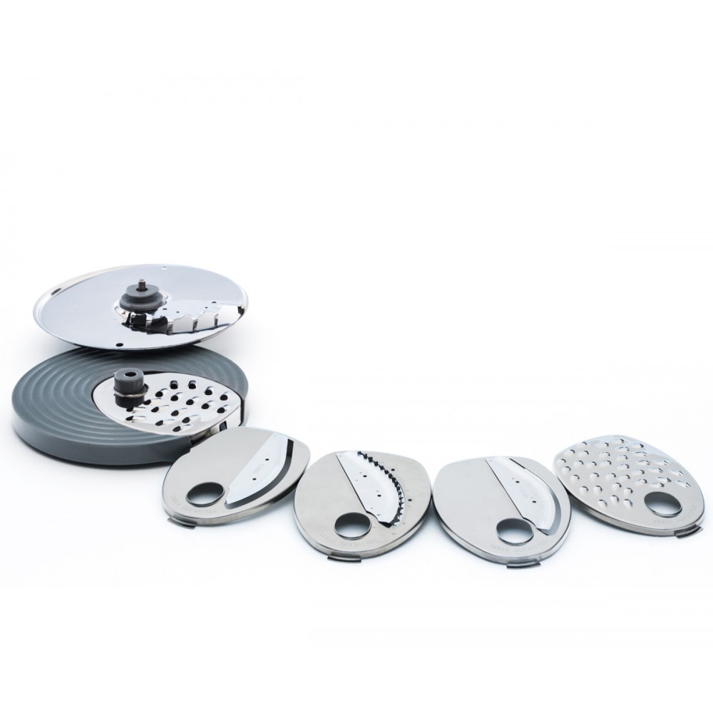 Aparatul este echipat cu șase discuri: două discuri de tăiere felii de diferite grosimi, două discuri de răzuire - fin şi grosier, două discuri de tăiere fâşii - mici și mari. Astfel puteţi obţine uşor bucăţi simetrice.
