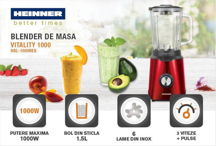Blender de masa Heinner Vitality 1000 HBL-1000RED, putere: 1000W, capacitate bol sticla; 1.5L, 3 viteze + Pulse, 6 lame din inox, indicator luminos, protectie supraincalzire, sistem de siguranta, nivel de zgomot: 80dB, rosu spray.
