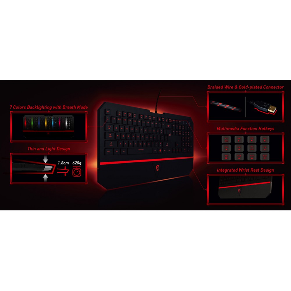 DS4100 USKB MSI INTERCEPTOR DS4100 US, USB, Extra Slim and Light Design, Integrated Wrist Rest Design,