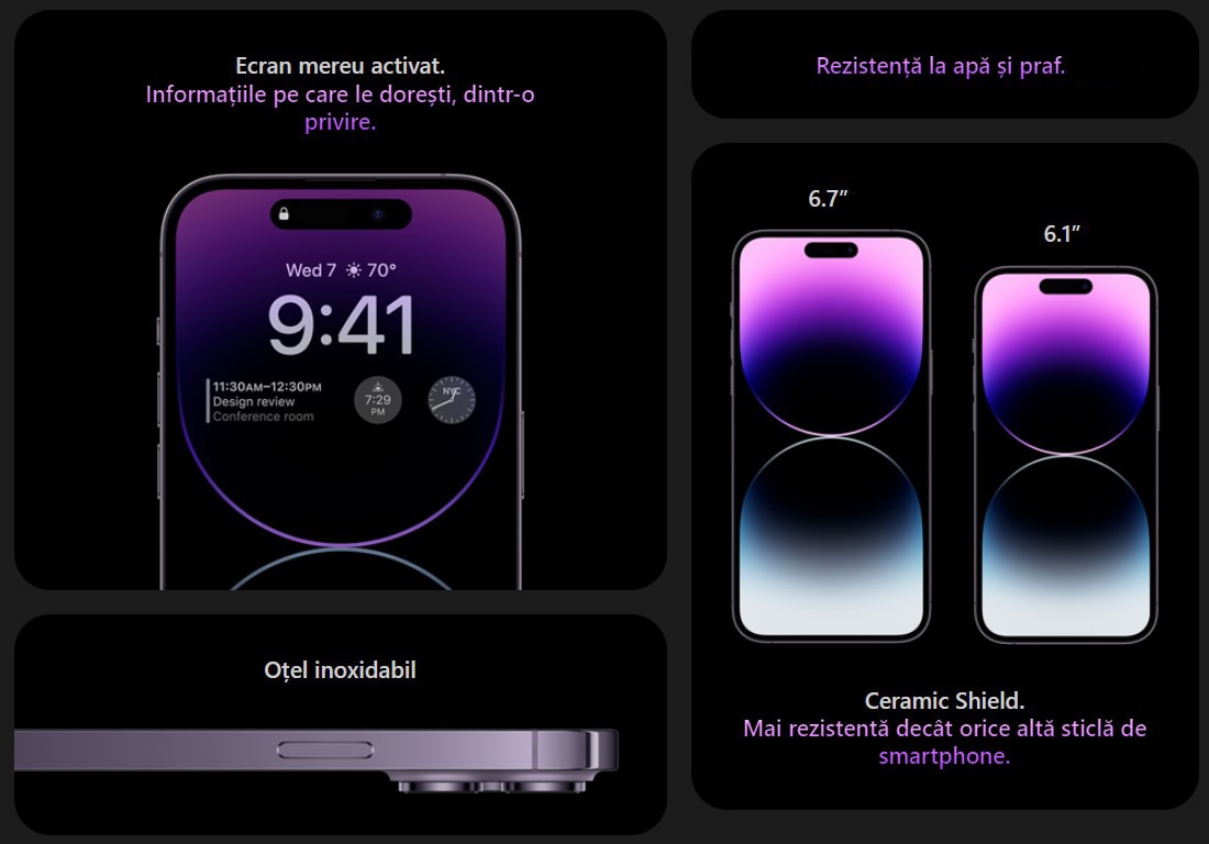 O modalitate magica de a interactiona cu iPhone. O functionalitate vitala de siguranta, conceputa pentru a salva vieti. O camera principala inovatoare de 48MP. Plus un afisaj de doua ori mai stralucitor in lumina soarelui. Toate propulsate de cel mai avansat cip din echiparea vreunui smartphone.