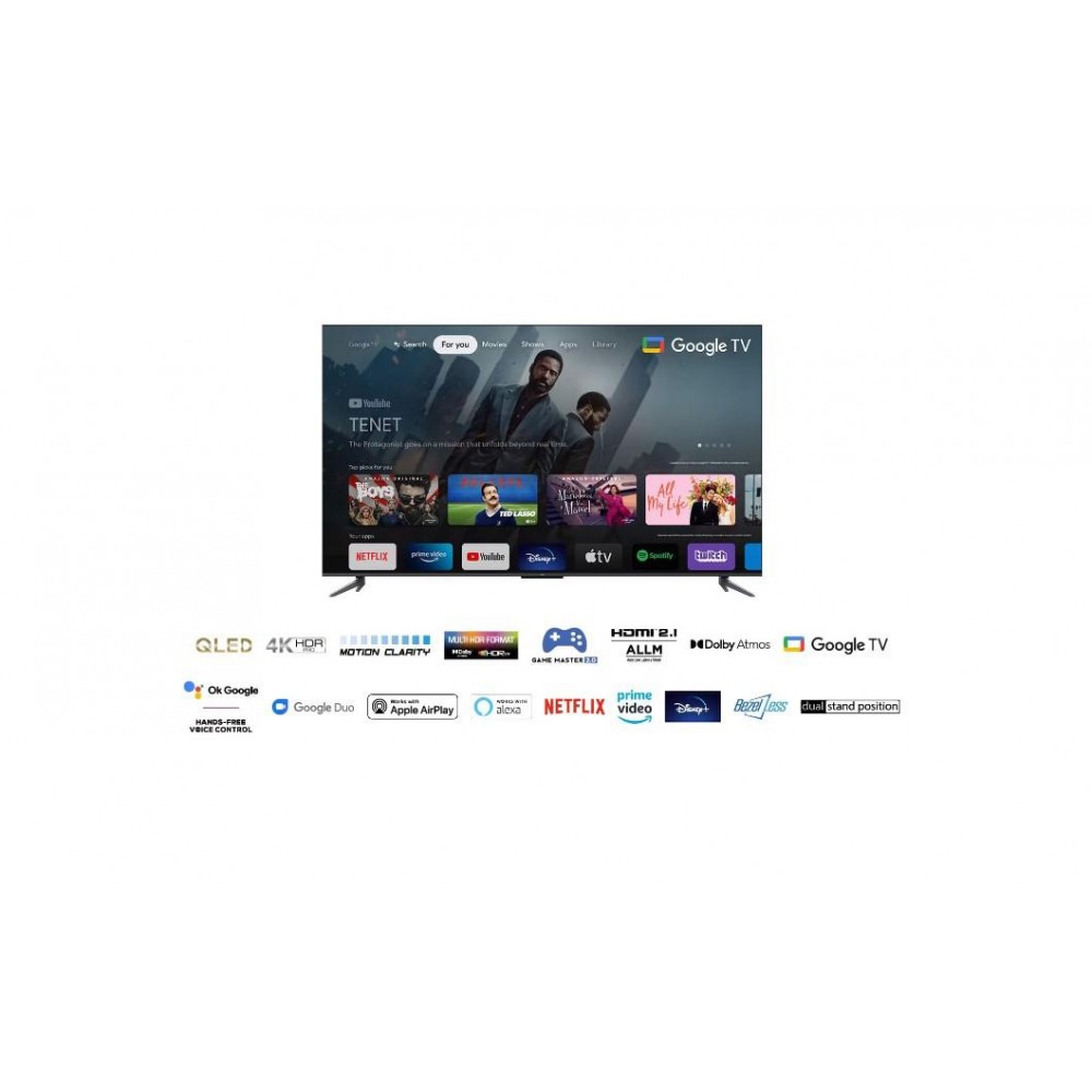 Brushed titanium metal front, Flat, Google TV, Mirroring iOS/Android, AiPQ 3.0 Engine, HDR10+/HLG/Dolby Vision IQ/Dolby AC-4/Dolby Atmos/Dolby TrueHD, Refresh rate: 50/60Hz+FRC / 120Hz FHD, Tuner: DVB-T2/C/S2, speakers 2x10W, Wi-Fi/Bluetooth SBC / 5.0, 1x Jack 3.5 mm/1x USB 3.0/1x RJ-45/CI slot/2x HDMI 2.1/1x Digital Optical Out/HDPC 2.3/1x Rf in, VESA 300x300,